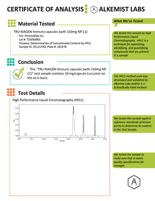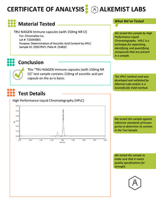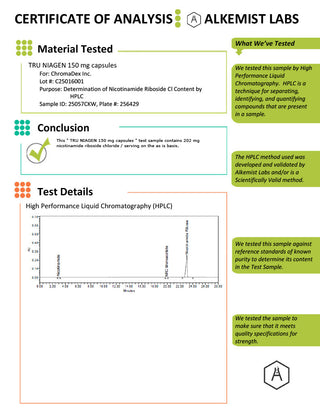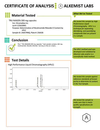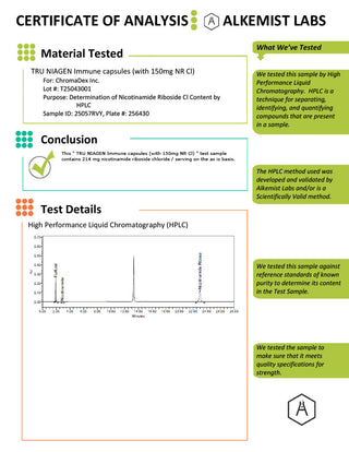 We partner with Alkemist Labs, a trusted leader in third-party testing, to ensure the quality of all Tru Niagen® products. Alkemist provides transparent, easy-to-access certificates of analysis (COAs) so you can see the latest test results for yourself. Check below for the most recent COAs.