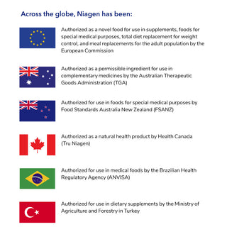 Niagen is approved by Health Canada through its rigorous Natural Health Product (NHP) process, ensuring safety and effectiveness. Additionally, it has been recognized by several international regulatory bodies, providing extra assurance that our key ingredient meets global safety standards.